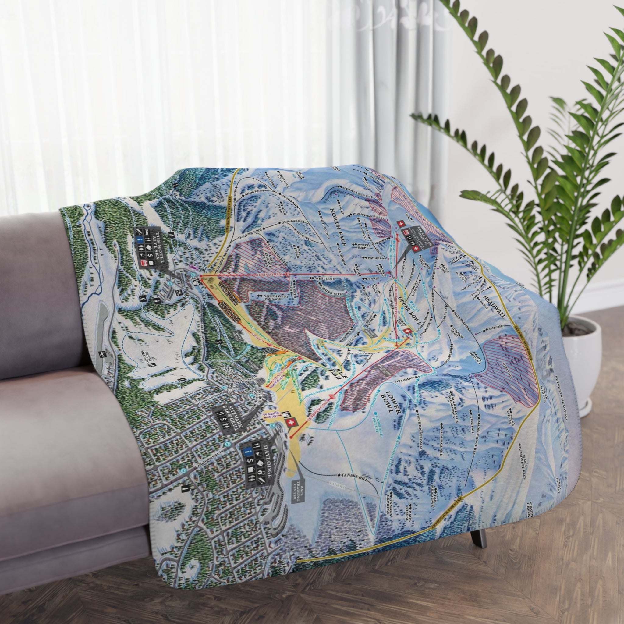 Stay cozy while showing off your love for Girdwod. This ultra-soft tan sherpa blanket features a detailed Alyeska winter trail map design, making it the perfect companion for ski lodge lounging, après-ski relaxation, or keeping warm on chilly nights. Sherpa on one side and smooth on the other, it’s both stylish and functional—a great gift for skiers, snowboarders, or anyone who loves Alaska’s iconic slopes.